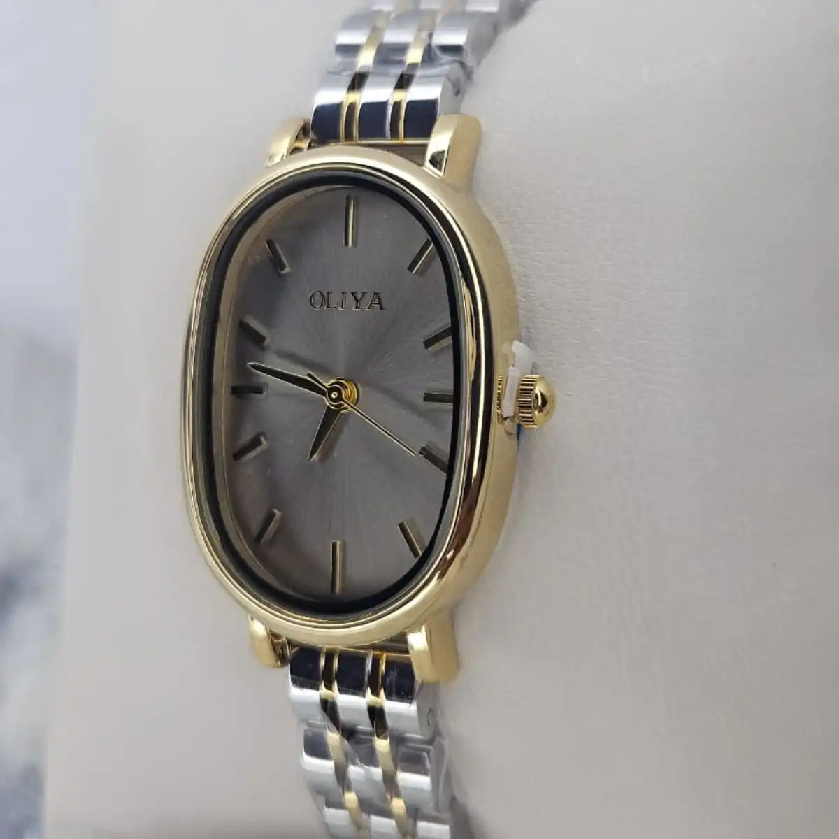 The OLIYA Oval Shape Women’s Watch has that perfect balance. The oval dial and grey coloring give it an understated elegance, while the two-tone strap adds a touch of sophistication. It’s the kind of piece that gets noticed without being too much. -