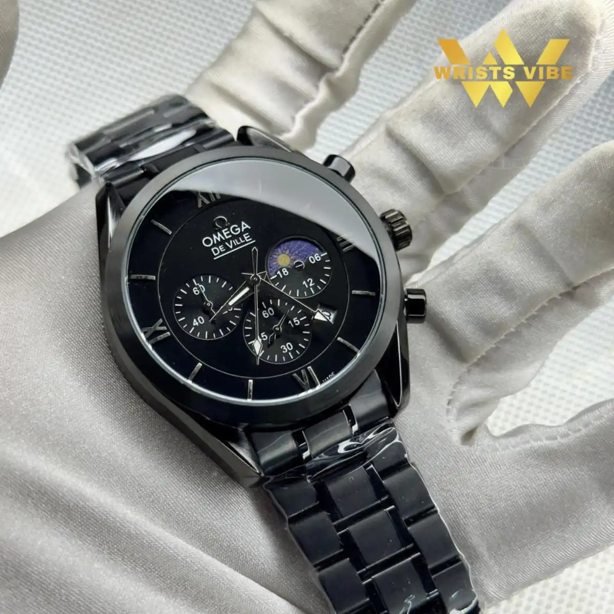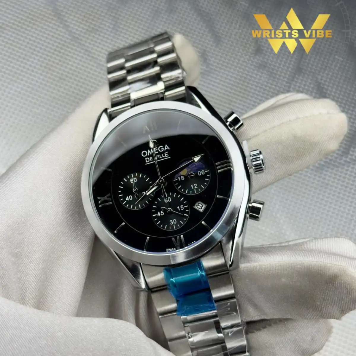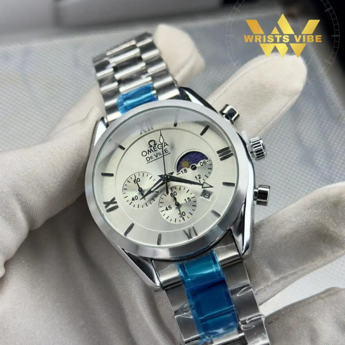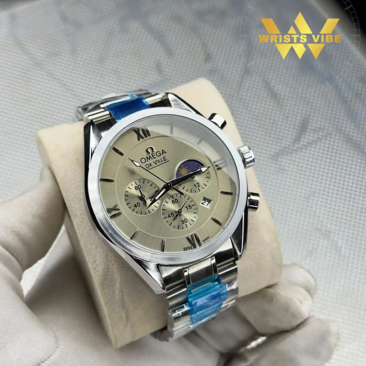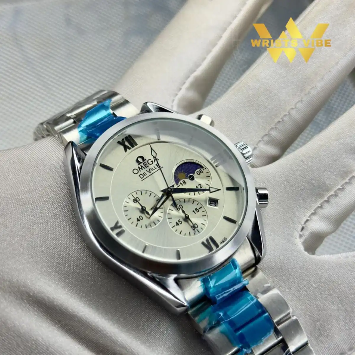 The Omega De Ville Style Chronograph Watch is one of those watches that makes your style feel complete the second you wear it. It is elegant without being too flashy, classy without feeling old-fashioned, and practical enough for regular use. From the moonphase-style sub-dial to the polished chain strap, the whole design gives off a refined, premium look that feels right at home on any wrist.