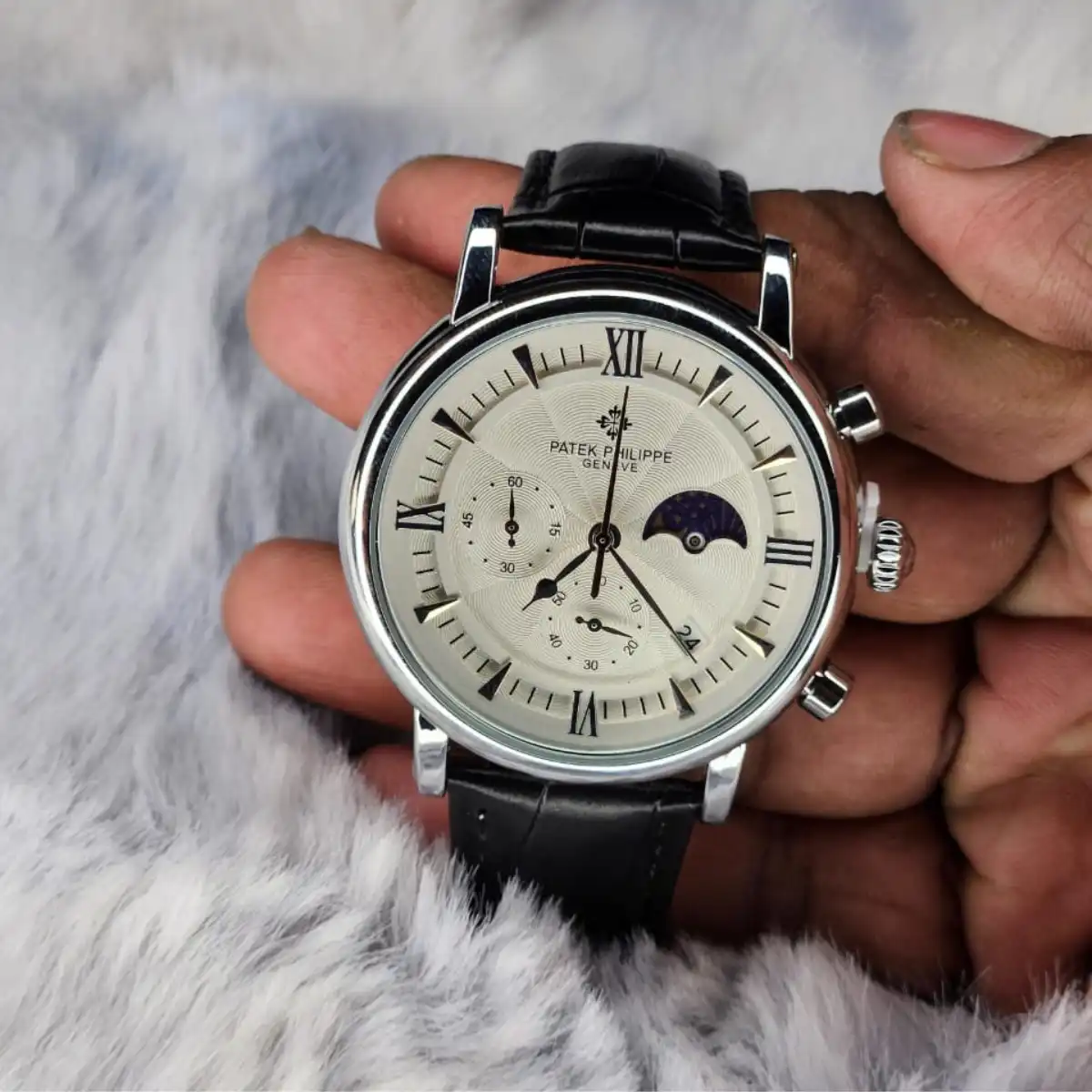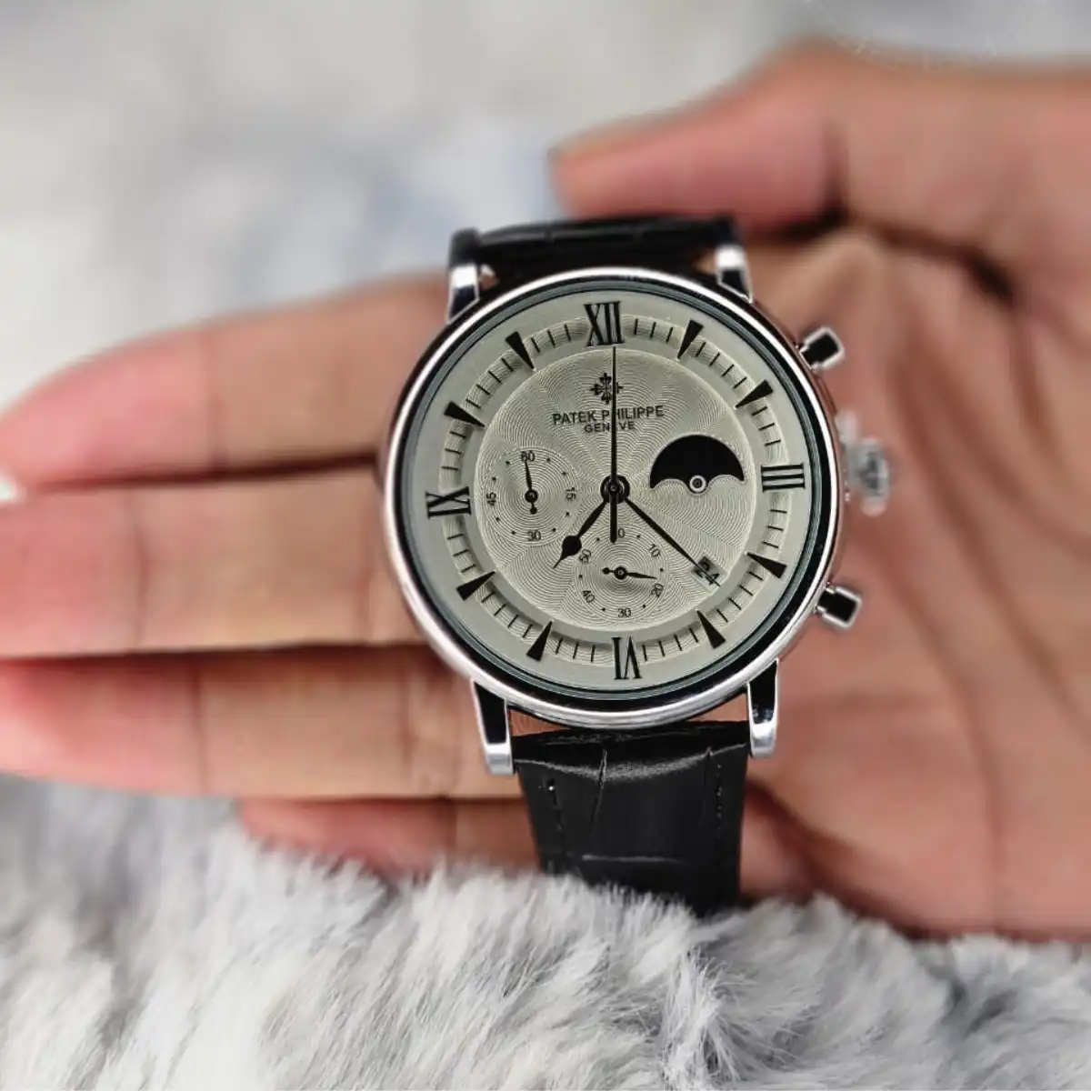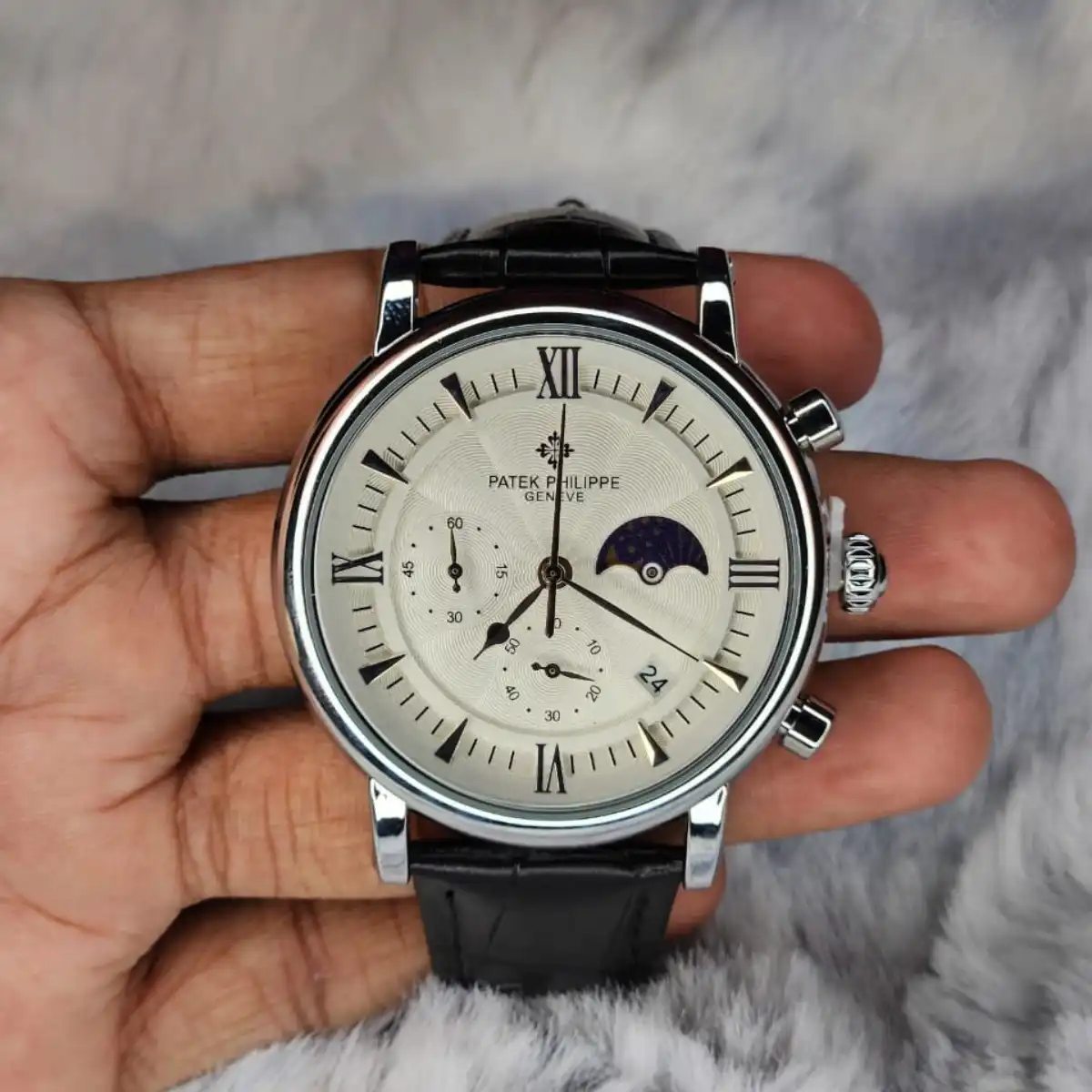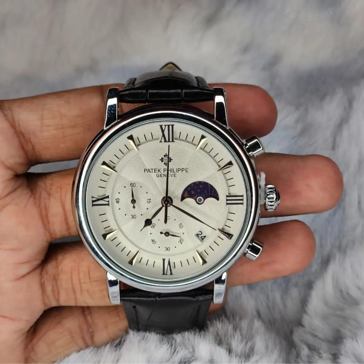 Looking for a watch that blends style, function, and luxury? The Patek Philippe Style Chronograph Quartz Men’s Watch offers a refined white dial with a moon phase display and date indicator. The black leather strap and polished round case give it a timeless, premium feel, making it perfect for formal occasions, office wear, or luxury gifting.