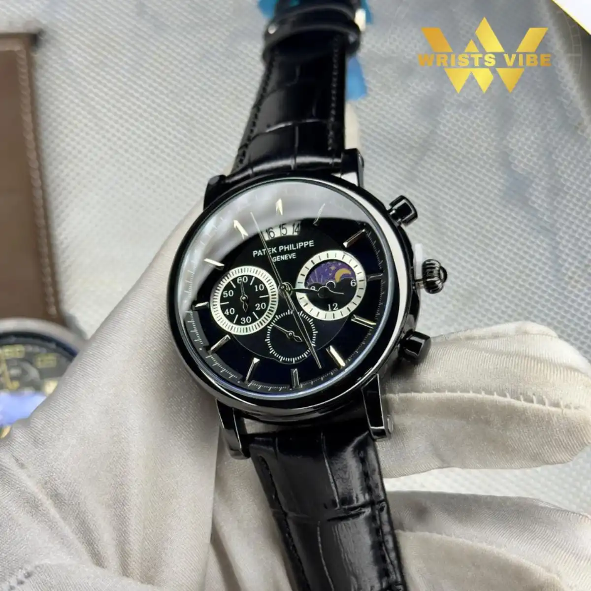 Patek Philippe Chronograph Quartz Men’s Watch – Leather Strap, Date & Moon Phase Display